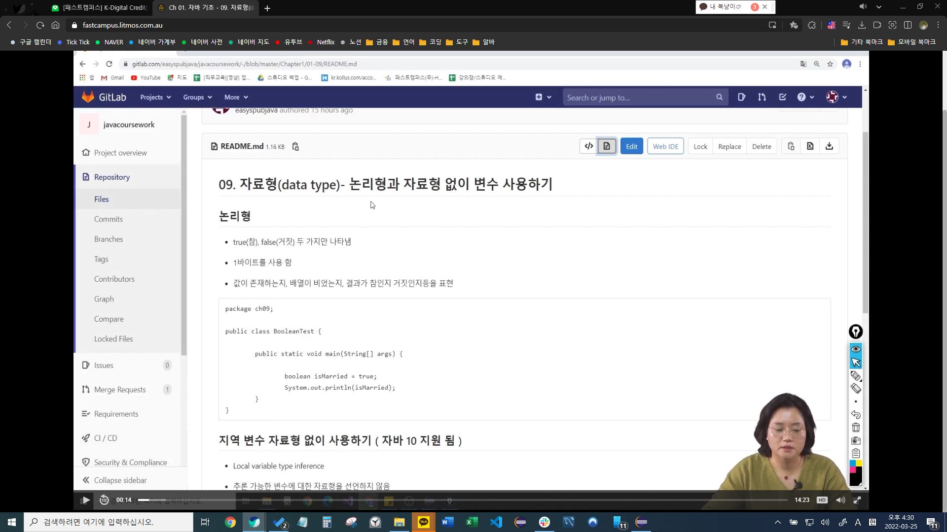 강의 영상은 패스트 캠퍼스가 아닌 별도의 플랫폼을 통해서 진행한다(Liatmos라는 온라인 교육 플랫폼이다). 로그인 할때 산업인력공단 OTP 인증을 거쳐야 입장이 가능한데, 아마 국비로 지원되는 사업이다보니 인증 절차가 까다로운 것 같았다. 강사님은 '박은종'님이다. Do it! 시리즈로 유명한 저자이셔서 놀랐다. 강사님의 실력에는 이견이 없을듯 했다.