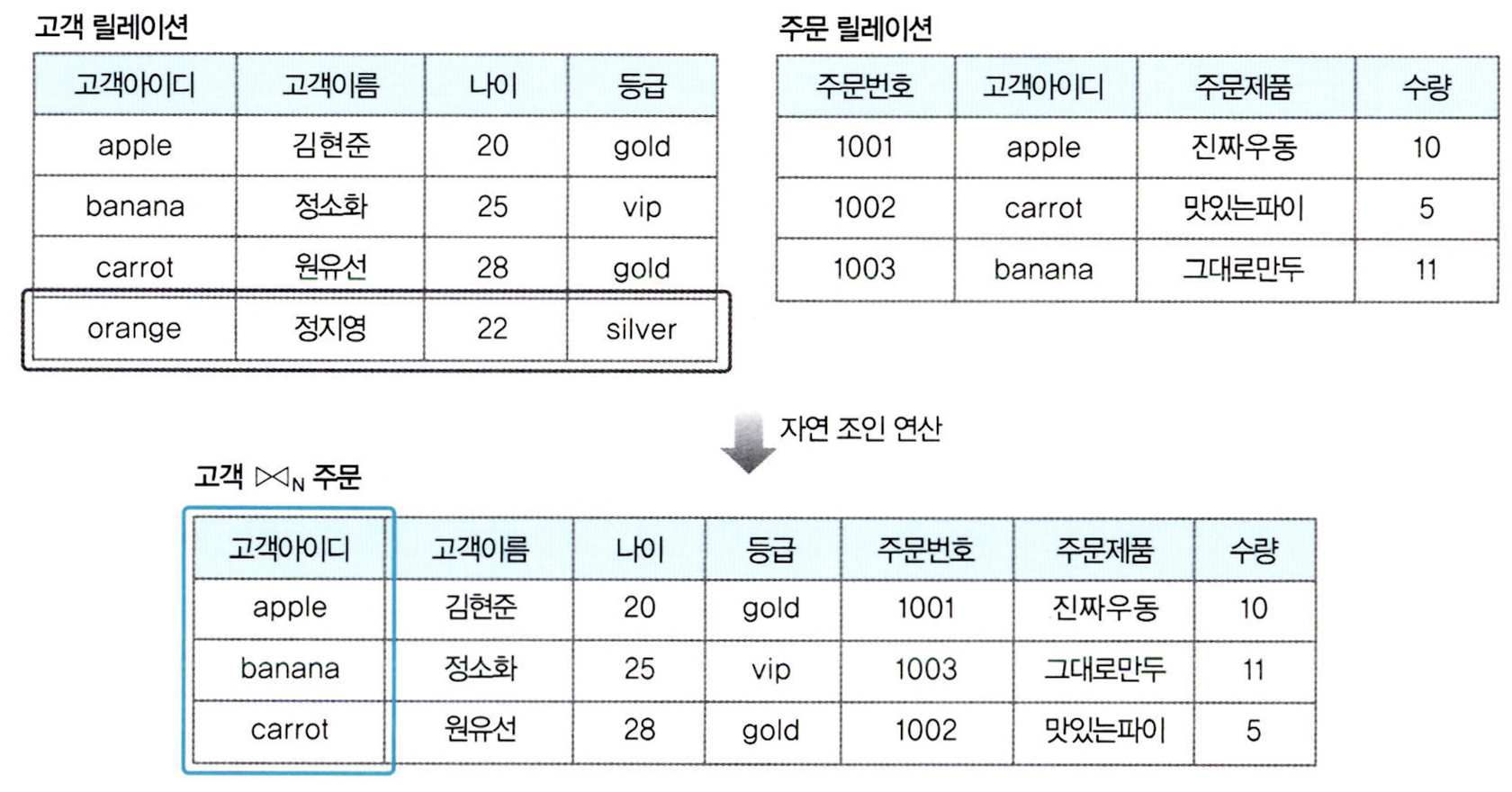 조인 속성 값이 같은 튜플끼리만 연결하여 새로운 릴레이션을 구성하기 때문에 고객아이디의 "orange" 튜플은 조인 연산에서 제외된다.