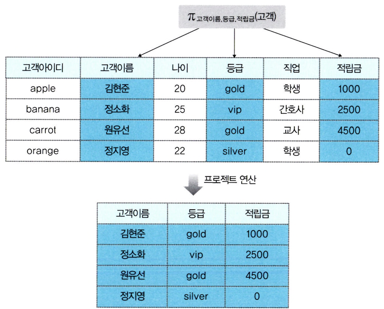 프로젝트는 릴레이션의 모든 속성 중 일부분만 선택하는데, 속성은 릴레이션에서 열에 해당되므로 프로젝트는 대상 릴레이션의 수직적 부분집합으로 결과 릴레이션을 구성하는 수직적 연산자이다.