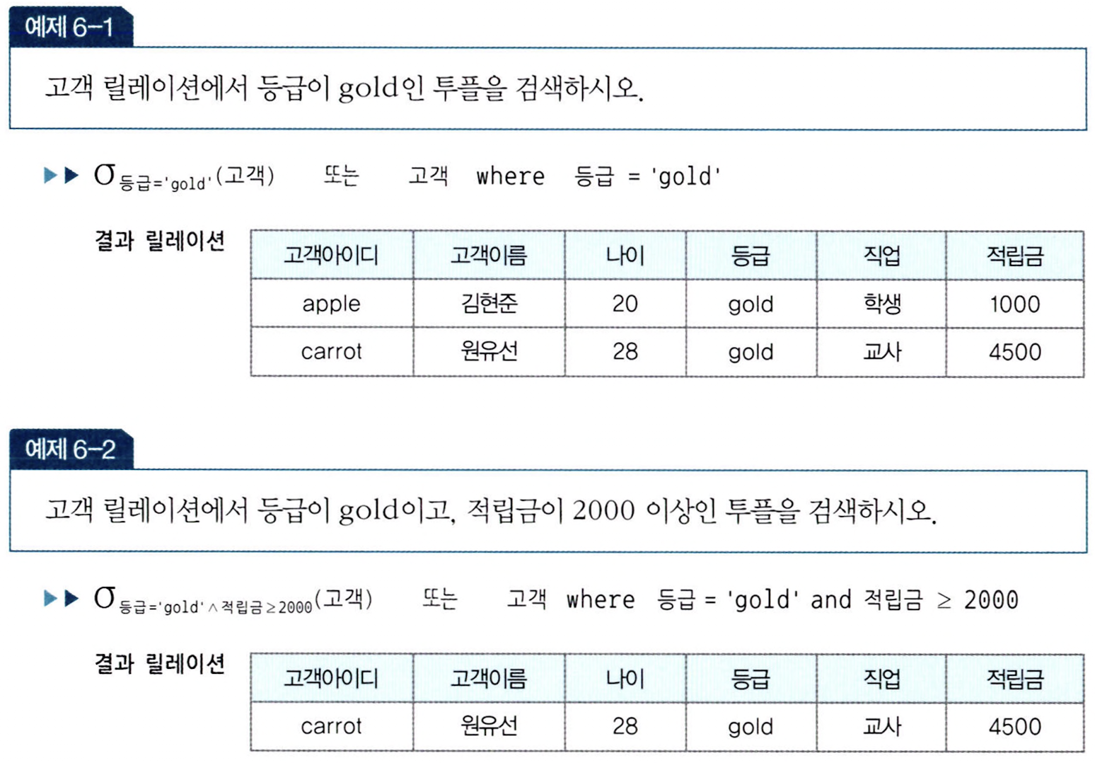 셀렉트 연산은 하나의 릴레이션을 대상으로 수행한다. 조건식엔 비교 연산자( >, <, >=, <=, =, !=)를 이용함으로 비교를 하기 위해서 상수의 데이터 타입이 속성의 도메인과 일치해야 한다. 다른 속성들 간의 비교로 구성할 때는 속성들의 도메인이 같아야 비교가 가능하다.