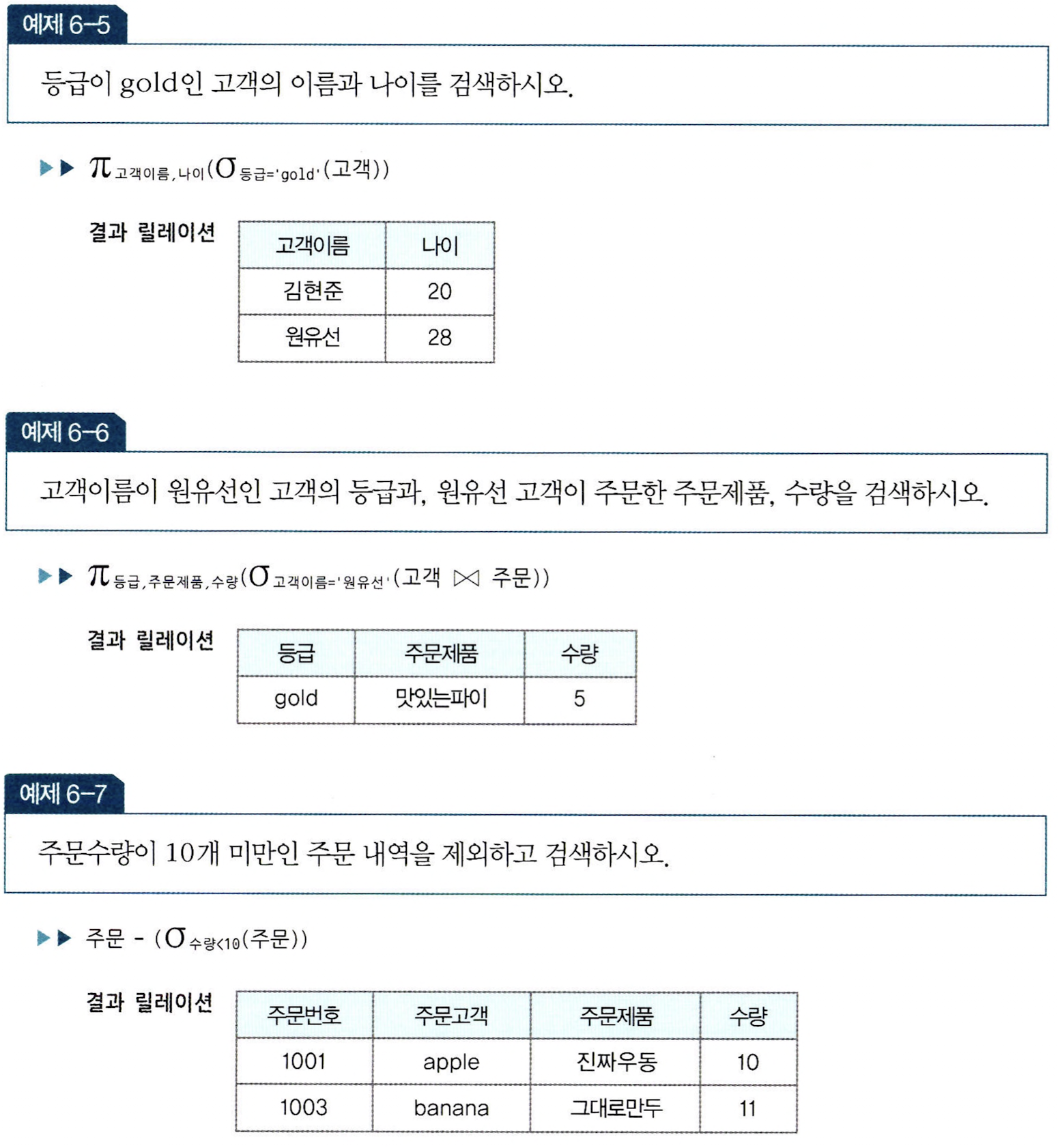 위 예시에도 주문 릴레이션의 "주문번호", "주문제품" 속성을 날린 뒤 고객 릴레이션과 조인한다. 따라서 주문을 한 적 있는 고객의 데이터만 검색이 가능하다.