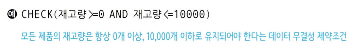 CHECK 키워드를 사용하면 특정 속성에 대한 제약조건을 지정할 수 있다. 테이블에 새로운 튜플을 삽입하거나 기존 튜플을 수정할 때도 이 제약 조건을 반드시 지켜야 하기 때문에 테이블에는 항상 유효한 데이터만 유지될 수 있다.