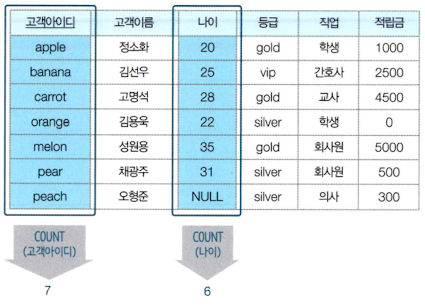 SUM, AVG 는 숫자 데이터 타입만 사용할 수 있고, COUNT, MIN, MAX는 모든 데이터 타입에 사용 가능하다.
