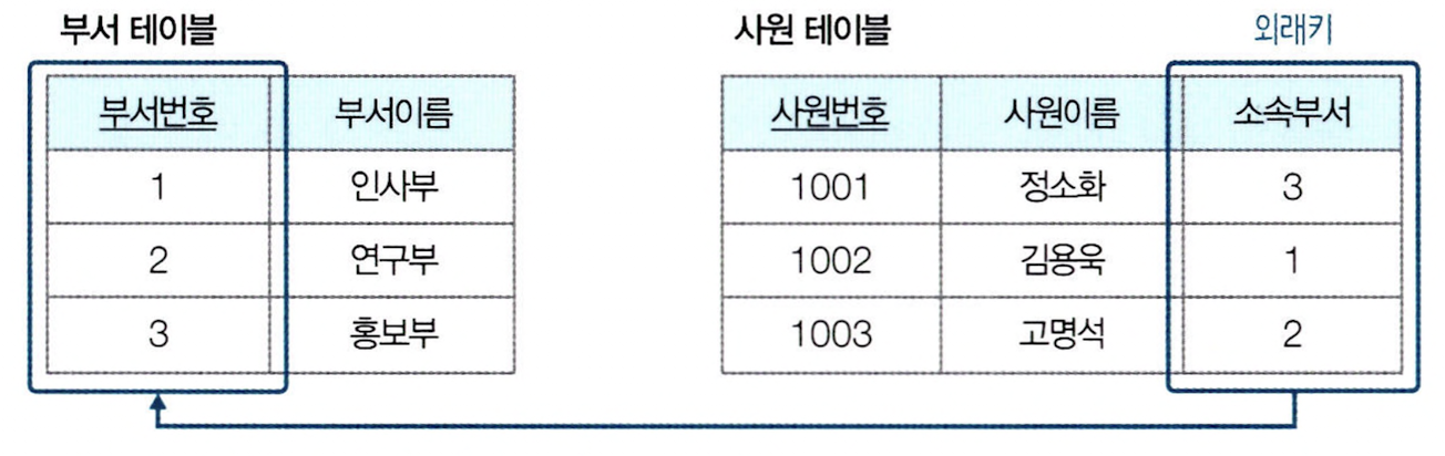외래키를 지정할 때는 REFERENCES 키워드로 출처를 분명히 밝혀야 한다. 이렇게 하면 참조되는 테이블에서 튜플을 함부로 삭제하거나 변경하지 못해 참조 무결성 제약조건을 지킬 수 있다.