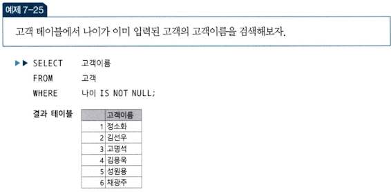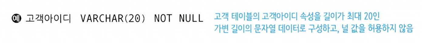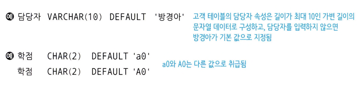 CREATE TABLE 문으로 생성되는 테이블의 속성은 기본적으로 널 값을 허용한다. 그러므로 널 값을 허용하지 않으려면 NOT NULL 키워드를 포함해야 한다.
