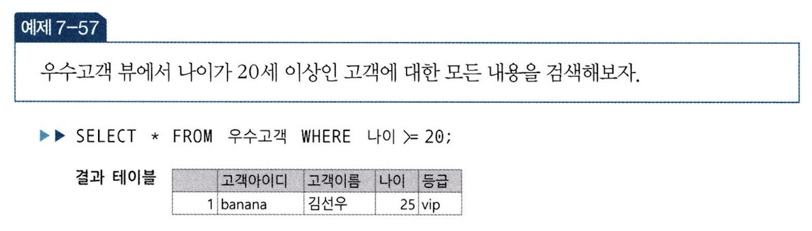 뷰에 대한 SELECT 문이 내부적으로는 기본 테이블에 대한 SELECT 문으로 변환되어 수행되기 때문이다. 따라서 위 예시에서 우수 고객 뷰에 대한 SELECT 문은 우수고객 뷰의 기본 테이블인 고객 테이블에 대한 SELECT 문으로 변환되어 수행된 후, 그 결과 테이블을 반환하는 것이다.