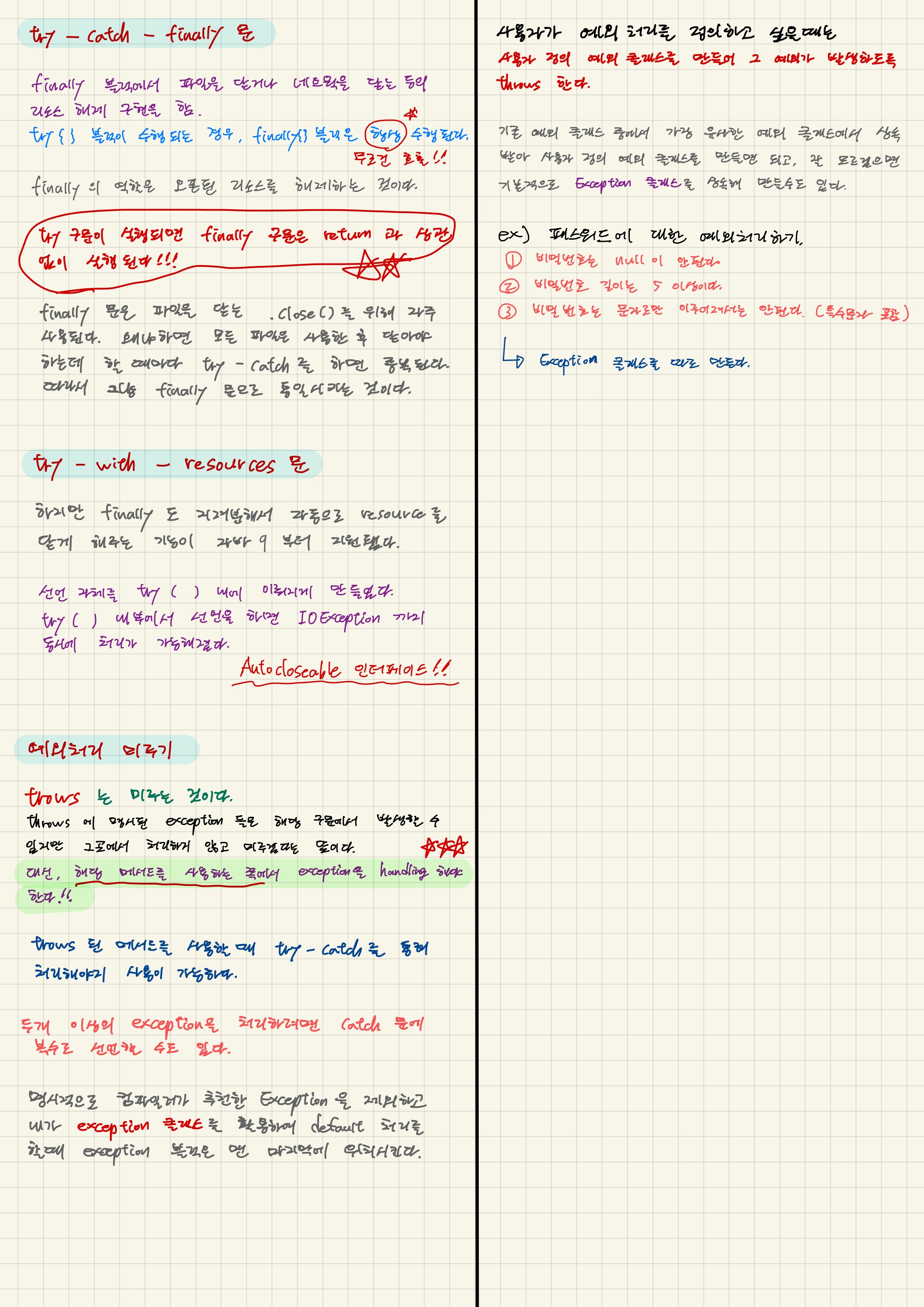 예외처리도 마찬가지다. try-catch 기능이 있다는 것은 알고 있었지만 사용 방법에 대해선 정확히 알지 못했다. 하지만 이젠 왜 사용해야 하는지 확실히 이해했다. 세세한 부분은 앞으로 내가 채워나가야겠다.