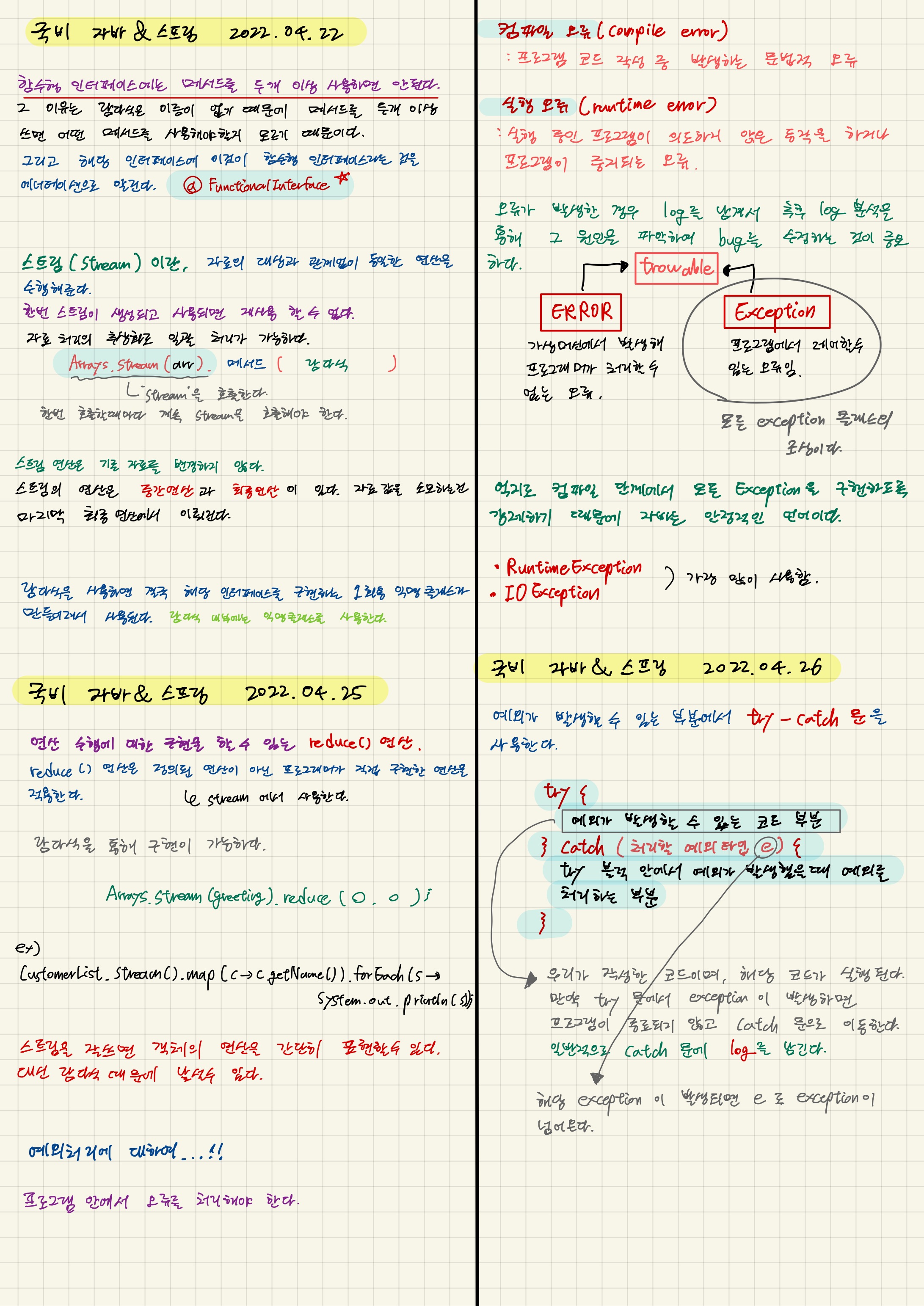이번 주 진도는 일단 내부 클래스, 함수형 클래스, 람다식, 스트림, 예외처리까지 나갔다. 내부 클래스와 예외처리는 자바의 정석 책으로 한번 봤어서 기본적인 틀은 알고 있었지만, 정확한 구현 방법과 쓰이는 상황에 대해선 잘 몰랐다. 함수형 클래스, 람다식, 스트림은 이름만 들어본 정도였다. 이번 수업을 통해 이들에 대한 두려움을 많이 없앨 수 있었다. 특히 람다식과 함수형 클래스, 스트림이 친숙하게 다가왔다. 이 기능이 왜 존재하는지, 어떻게 사용되는지를 보고 나니 학습의 이유를 깨닫게 됐다. 이제 다른 학습 자료를 보아도 흡수가 더 잘 될 것 같았다. 추가 학습의 교두보가 된 것이다.