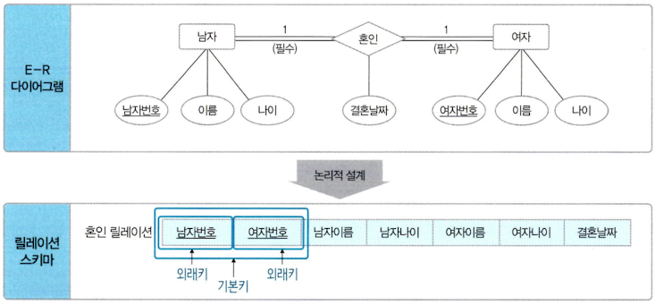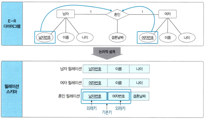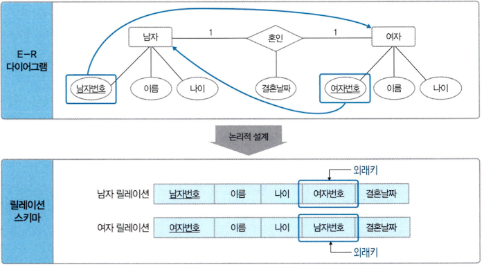 위 예시에서 남자와 여자 개체는 서로 일대일 혼인 관계를 맺는다. 규칙 4-1에 따라 각자 서로의 기본키를 외래키로 가진다. 그리고 혼인 관계의 속성인 결혼날짜도 남녀 릴레이션에 모두 포함시킨다.