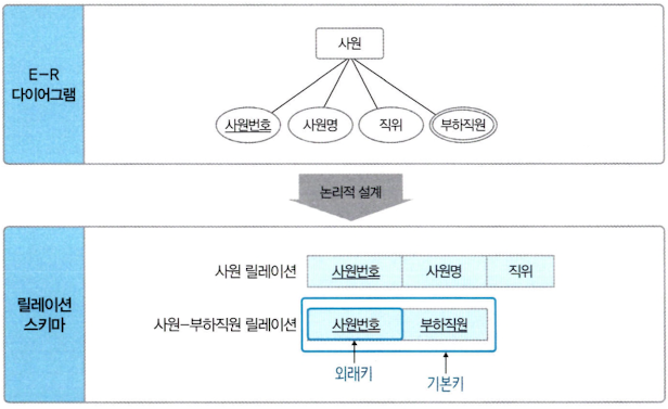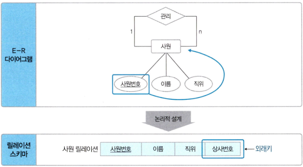 위 E-R 다이어그램에서 사원 개체가 자기 자신과 관리 관계를 맺고 있다. 그리고 일대다 관계를 맺고 있어서 사원의 기본키인 사원번호를 외래키로 본인이 가져간다.