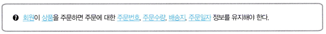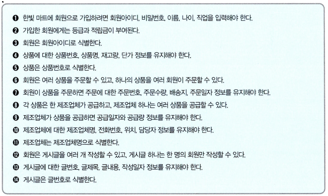 예를 들어 인터넷으로 회원들에게 상품을 판매하는 한빛 마트를 위한 데이터베이스를 개발한다고 가정했을 때 아래와 같은 요구 사항 명세서가 나왔다고 생각하자.