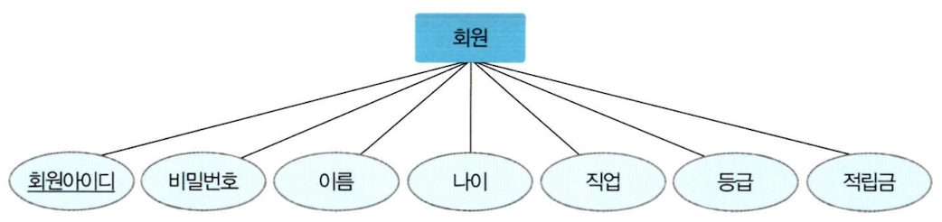 - 회원아이디, 비밀번호, 이름, 나이, 직업은 중요한 데이터지만 독립적인 대상이 아니다. 회원이 가지고 있는 중요 데이터 자체로 속성이 된다.