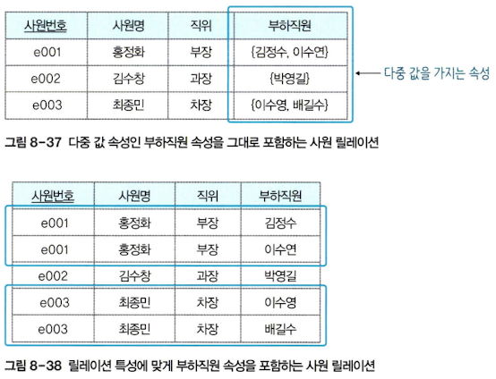 다중 값을 가지는 속성은 불가능하다. 그렇다고 그림 8-38에서 제안한 부분이 완벽한 것도 아니다. 왜냐하면 불필요한 중복 데이터가 발생하기 때문이다. 그래서 다중 값 속성을 릴레이션에 포함시키려면 릴레이션을 분해할 필요가 있다.