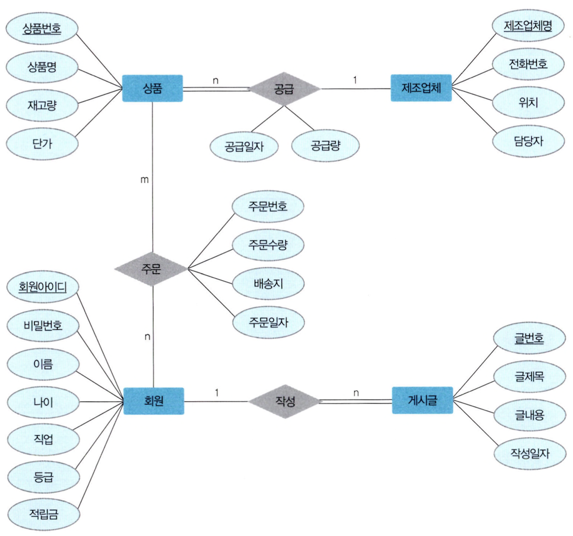 이렇게 요구 사항 명세서에서 추출한 개체, 속성, 관계를 하나의 E-R 다이어그램으로 표현한 결과는 다음과 같다. 이 E-R 다이어그램이 한빛 마트의 데이터베이스에 대한 요구 사항 명세서를 개념적으로 모델링하여 표현한 것으로써 개념적 설계 단계의 결과물인 개념적 스키마가 된다.