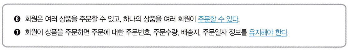 - '주문할 수 있다'는 회원 개체와 상품 개체가 맺는 관계를 설명한다. 이를 통해 회원 개체와 상품 개체가 맺고 있는 주문 관계를 추출할 수 있다. 그리고 회원 한 명이 여러 상품을 주문할 수 있고, 하나의 상품을 여러 회원이 주문할 수 있다고 했으니 주문 관계는 다대다(n:m) 관계가 된다. 또한 회원이 상품을 꼭 주문할 필요는 없으니 주문 관계에 선택적으로 참여한다고 볼 수 있다.