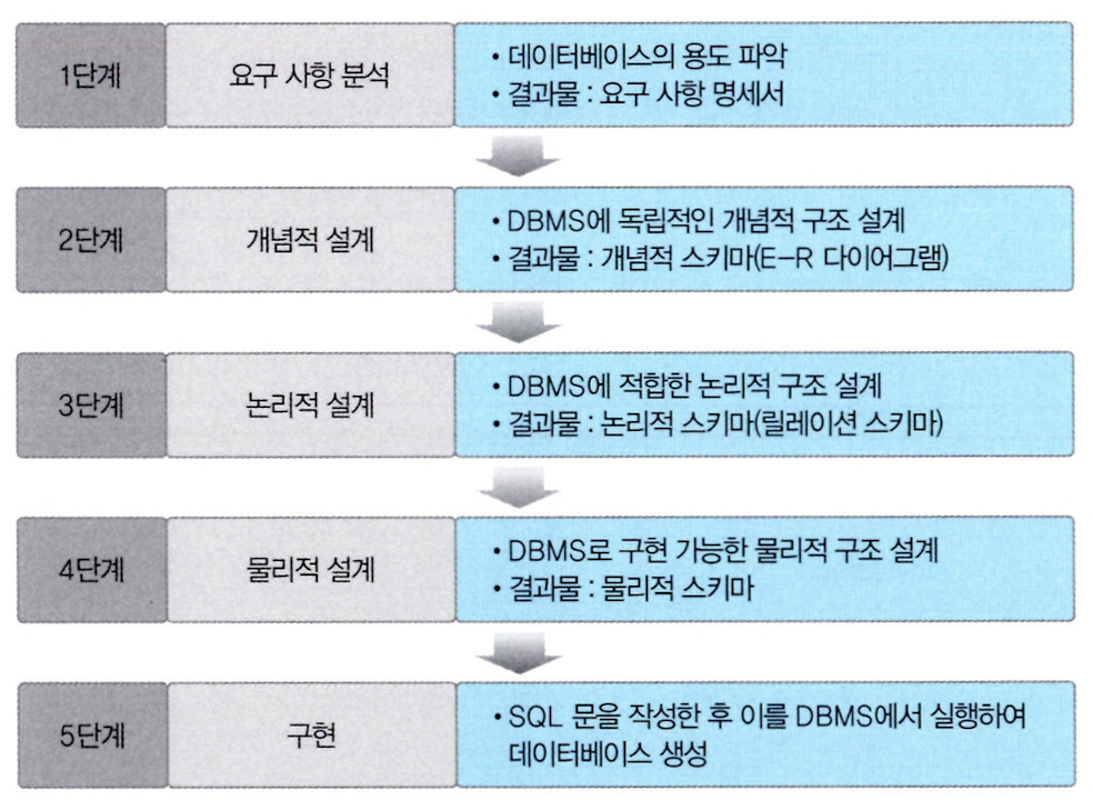 조직 구성원들의 다양한 요구 사항을 고려하여 제대로 된 데이터베이스를 구축하는 흐름은 다음과 같다.