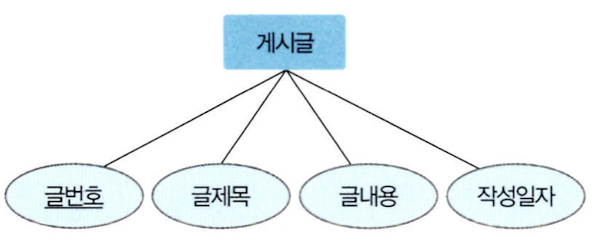 개체는 사각형으로, 속성은 타원형으로, 키 속성은 이름에 밑줄을 그어 표시한다.