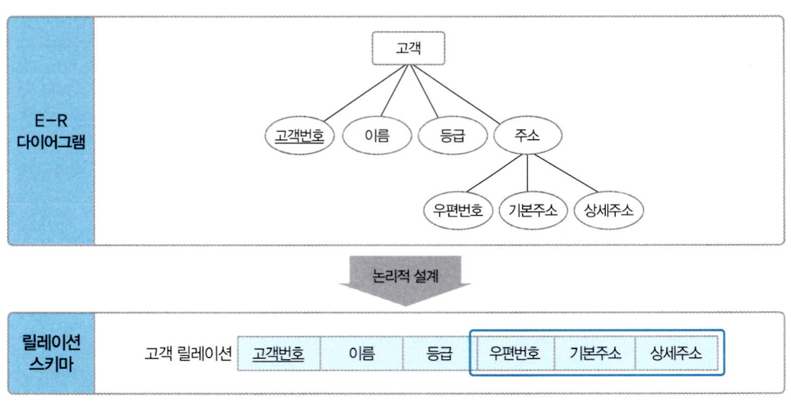 고객 객체의 단순 속성인 고객번호, 이름, 등급은 그대로 고객 릴레이션의 속성으로 변환한다. 하지만 고객 개체가 주소란 복합 속성을 가지고 있기에 이를 구성하고 있는 단순 속성들로만 릴레이션의 속성으로 변환한다. 따라서 주소 속성은 사라지고 우편번호, 기본주소, 상세주소 속성만 포함된다.