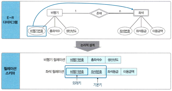 좌석은 비행기가 없으면 존재할 수 없다. 따라서 좌석 개체는 약한 개체가 된다. 존재 관계의 1측 개체에 해당하는 비행기 릴레이션의 기본키인 비행기번호 속성을 n측 개체에 해당하는 좌석 릴레이션에 포함시키고 외래키로 지정한다. 그런 다음 좌석 개체 릴레이션의 키 속성인 좌석번호와 외래키인 비행기번호를 조합하여 좌석 릴레이션의 기본키로 지정한다.