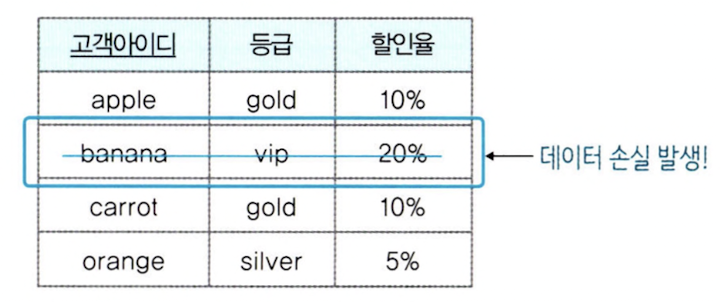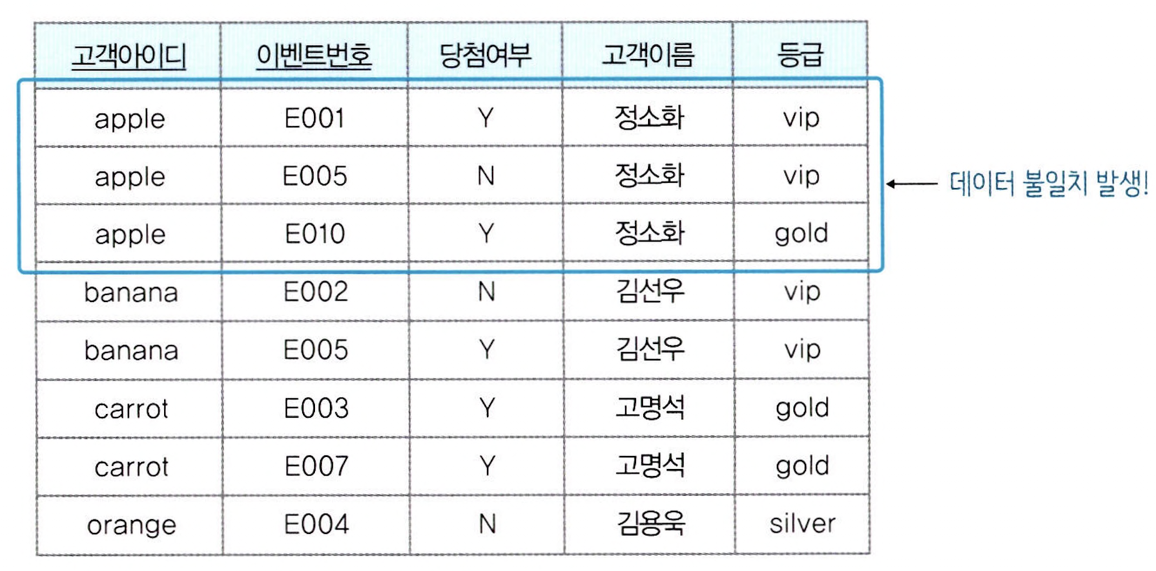 고객 아이디가 apple인 고객의 튜플이 총 3개나 있다. 만약 이 고객의 등급이 gold에서 vip로 변경되면 새 튜플의 등급 속성의 값 모두 vip로 변경해야 한다. 실수로 일부 튜플의 등급 속성의 값만 변경하면 동일한 고객이 서로 다른 두 개의 등급 값을 가져서 데이터 일관성에 문제가 발생한다.