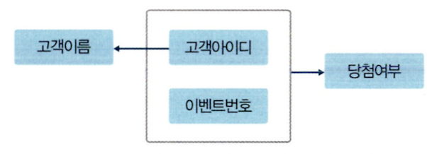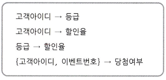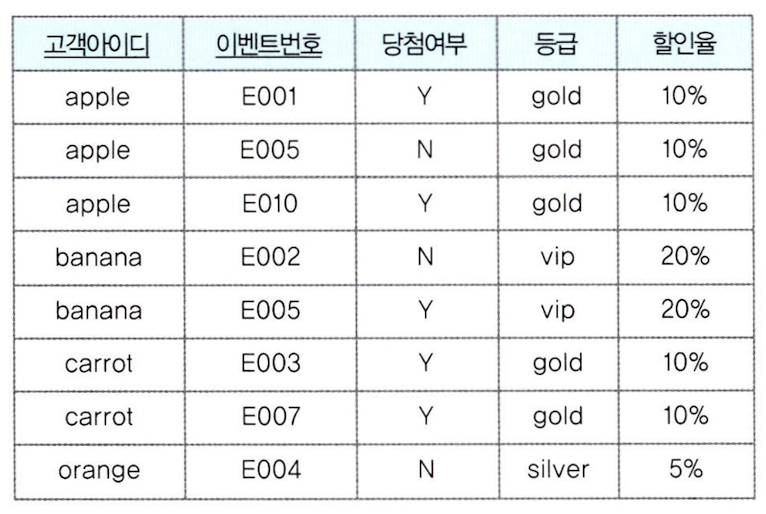 총 5개의 속성으로 구성되어 있고 [고객아이디, 이벤트번호] 속성 집합이 기본키 역할을 담당한다. [고객아이디]가 [등급]와 [할인율]을 유일하게 결정하며, [등급]에 따라 [할인율]이 결정된다. 그리고 [고객아이디, 이벤트번호]가 [당첨여부] 속성을 유일하게 결정한다.