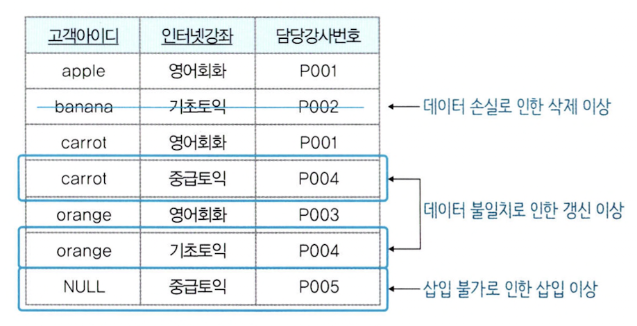 - 삭제 이상 : 튜플을 삭제하면 꼭 필요한 데이터까지 함께 삭제되는 데이터 손실의 문제