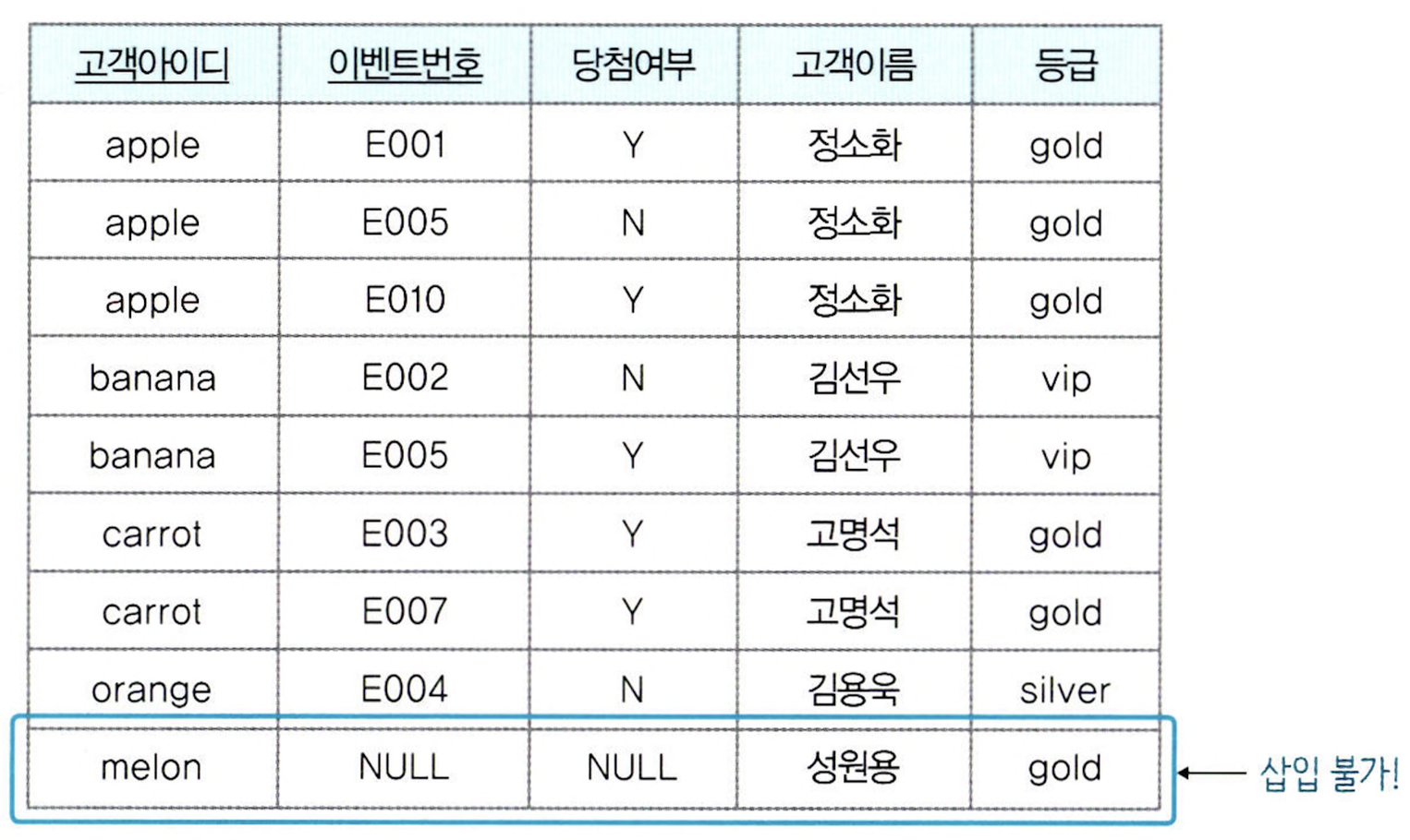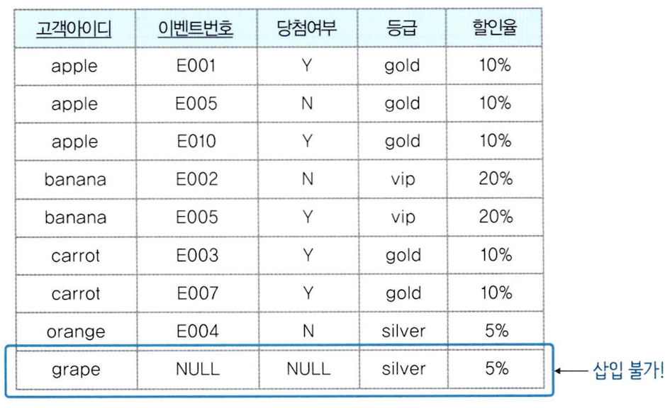 위 릴레이션의 기본키는 [고객아이디, 이벤트번호]라서 새 고객에 대한 데이터를 삽입하려면 그 고객은 이벤트에 무조건 참여해야 한다. 그렇지 않으면 이벤트번호에 널 값이 들어가 개체 무결성 제약조건을 위반하게 된다(기본키는 널 값을 가질 수 없다). 그래서 고객아이디와 등급, 할인율만 삽입하는 것이 불가능하다.