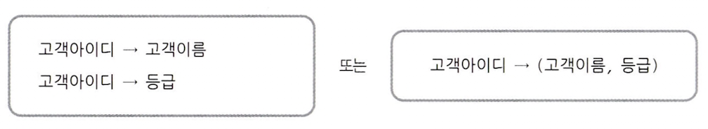 고객 릴레이션에서 각 고객아이디 속성 값에 대응되는 고객이름 속성과 등급 속성의 값이 단 하나이므로, 고객아이디가 고객이름과 등급을 결정한다고 볼 수 있다. 고객아이디가 apple인 고객은 이름이 정소화, 등급은 gold인 한 사람밖에 없다,. 따라서 고객 릴레이션에서 고객이름과 등급속성은 고객아이디 속성에 함수적으로 종속되어 있다.