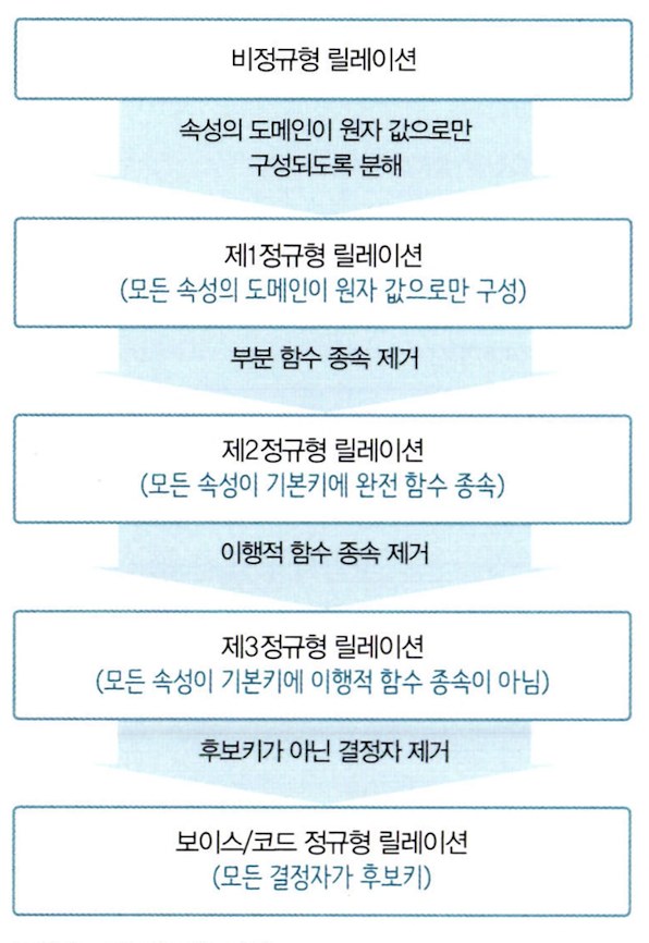 이상 현상이 발생하지 않도록 하려면, 관련 있는 속성들로만 릴레이션을 구성해야 하는데 이를 위해 필요한 것이 정규화이다. 정규화란, 이상 현상을 방지하고자 관련있는 속성들로만 구성하기 위해 릴레이션을 분해(decomposition)하는과정이다.