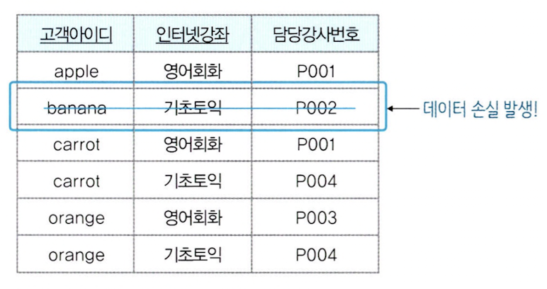 고객아이디가 banana인 고객이 인터넷강좌 신청을 취소해서 해당 고객에 대한 튜플을 삭제하면, P002 강사가 기초토익 강좌를 담당하고 있다는 정보도 함께 삭제된다. 그런데 이 튜플은 P002 강사에 대한 정보를 담고 있는 유일한 튜플이므로 삭제하면 해당 강사에 대한 정보가 더 이상 존재하지 않게 된다.