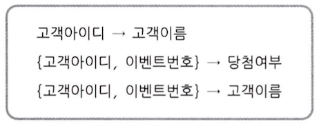 그리고 [고객아이디, 이벤트번호] 속성 집합은 [당첨여부] 속성을 유일하게 정한다. apple 고객이 참여한 E001 이벤트의 당첨 여부는 Y만 존재하기 때문이다. 따라서 당첨여부는 [고객아이디, 이벤트번호]에 종속되어 있어 [고객아이디, 이벤트번호]는 결정자, 당첨여부는 종속자가 된다. 물론 [고객이름]도 기본키인 [고객아이디, 이벤트번호]에 종속되어 있다.