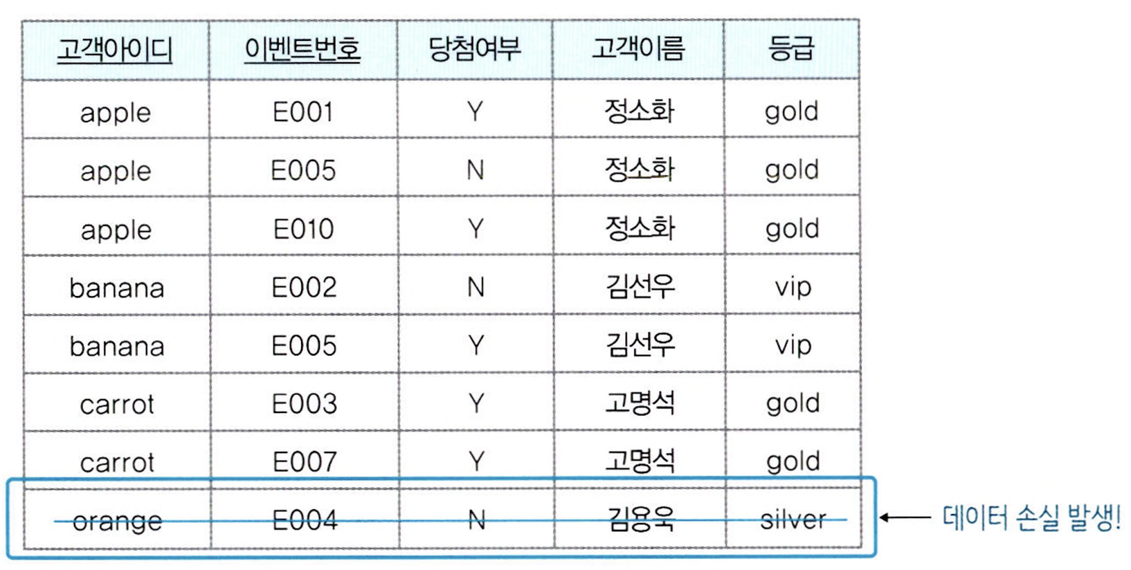 고객 아이디가 orange 인 고객 관련 튜플은 단 한 개이다. 만약 이 고객이 참여한 E004 이벤트 참여 기록을 삭제하려면 이벤트와 관련없는 고객 정보, 즉 등급, 할인율도 모두 사라지게 된다. 고객 정보가 함께 삭제되므로 이 고객과 관련해 꼭 필요한 데이터를 유지할 수 없게 된다.