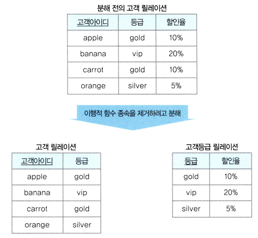 위 릴레이션은 고객아이디 -> 등급, 등급 -> 할인율의 함수 종속 관계를 유지할 수 있도록 2개의 릴레이션으로 분해하면 된다. 새로 분해된 고객 릴레이션과 고객등급 릴레이션으로 모두 제3 정규형에 속하게 된다.