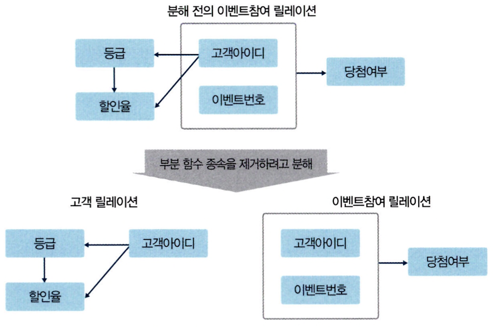 위 예시에서 봤듯이 [등급], [할인율] 속성이 관련 없는 [이벤트번호], [당첨여부] 속성과 같이 존재하며, 부분 함수 종속이 있었기 때문에 여러 이상 현상이 발생했다. 따라서 2개의 릴레이션으로 분해하면, 분해된 고객 릴레이션과 이벤트참여 릴레이션은 모두 제2 정규형에 속하게 된다.