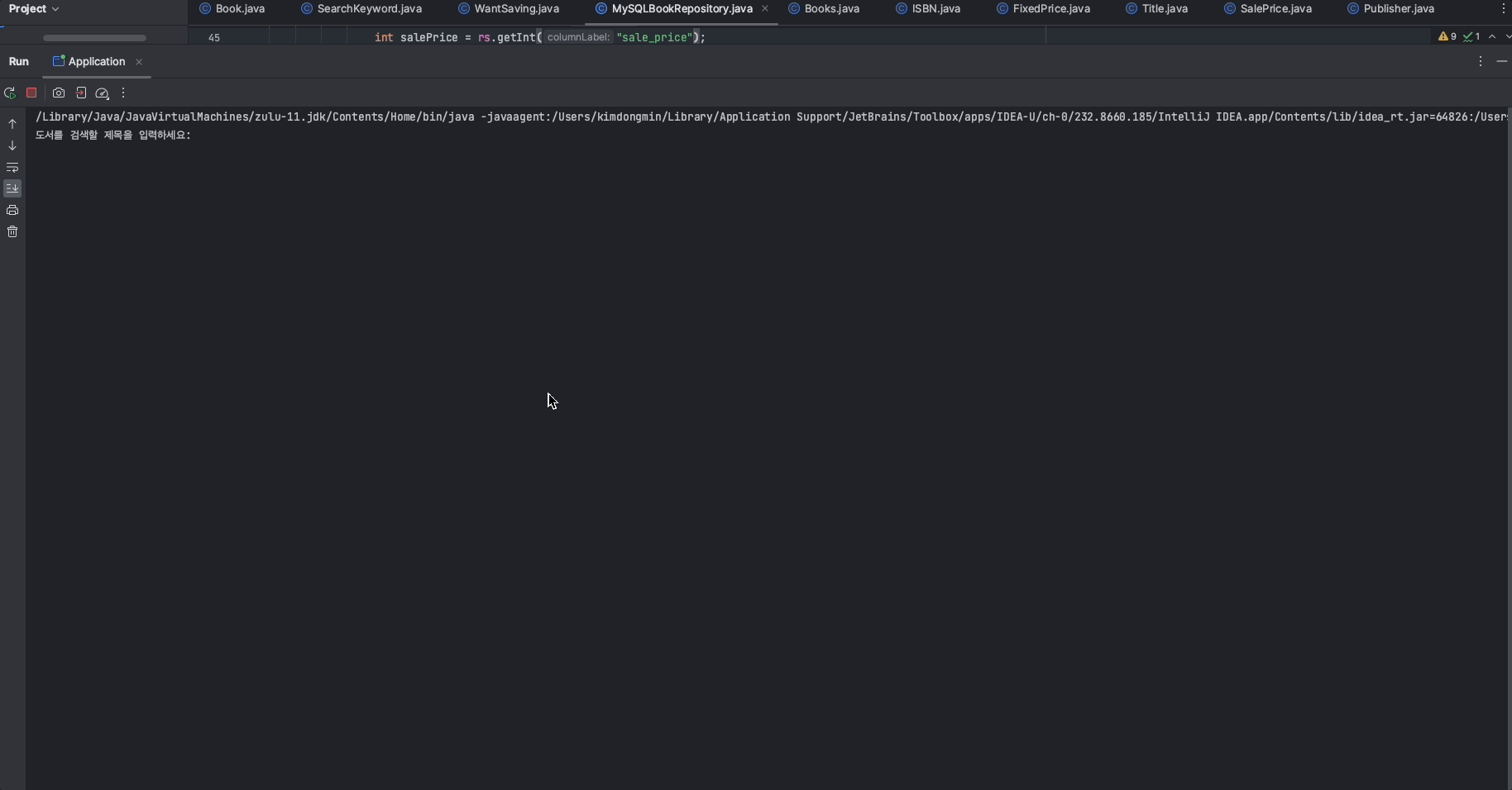 지난번 과제에선 Application 객체에서 로직의 흐름이 이어졌다. 생각해 보면 Application 클래스에 입력받는 것, 출력하는 것, 주요 흐름의 로직이 있는 것이 좀 어색하게 느껴졌다. 보다 더 적합한 클래스가 없을까 생각한 게 BookListSearchUserInterface 클래스다. 클래스 이름에서 나타나 듯 '유저가 책 검색을 위해 사용되는 최전방'이랄까나? Application의 main 메소드에서 해당 클래스의 객체를 만들고, start()를 호출해 비로소 프로그램이 실행된다.