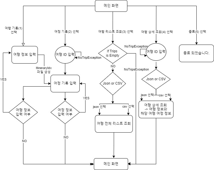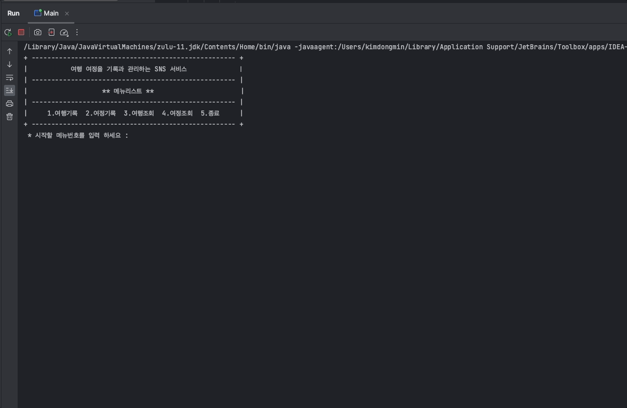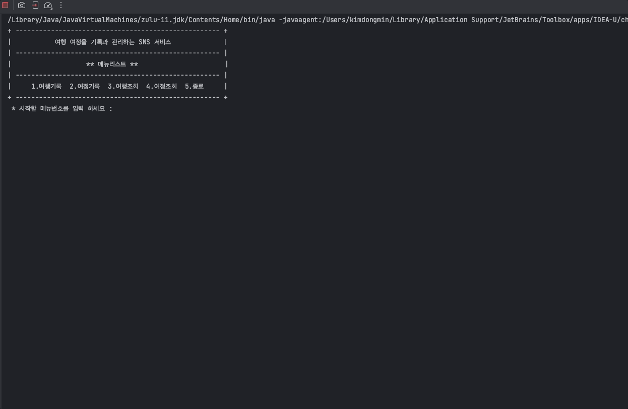 토이 프로젝트의 최종 구현 목표는 "여행 여정을 기록하고 관리하는 SNS 서비스"이다. 이를 위해 총 3단계로 진행된다. 먼저 1단계는 오로지 Java 프로그램으로 구동되어야 한다. 이후 2단계는 Spring 프로젝트, 그리고 Spring boot 프로젝트로 점점 업그레이드를 시켜야 한다. 아직 Spring에 익숙하지 않은 상태라 일단 Java로만 진행되는 점에서 그나마 안심이 됐다. 그동안 공부한 Java 문법과 파일 입출력, 예외처리 기능을 잘 구현해 보고자 노력했다.