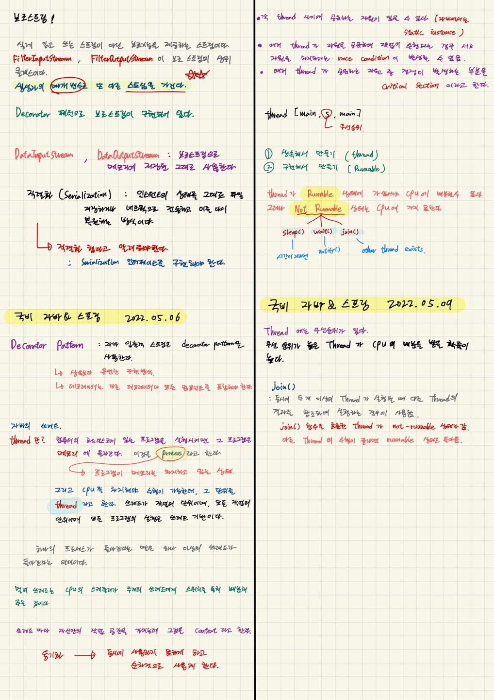 본격적으로 쓰레드스레드 공부를 했다. 자바를 공부하면서 스레드란 단어는 많이 보았지만 정확히 무엇인지 잘 몰랐는데 어떤 개념인지 알 수 있었다. 컴퓨터의 하드디스크에 있는 프로그램을 실행시키면 그 프로그램은 메모리에 올라가고, 이후 CPU를 차지해야 수행이 가능한데 그 단위를 thread라고 한다. 지금까지 짰던 짤막한 코드들은 모두 단일 스레드로 진행했다.