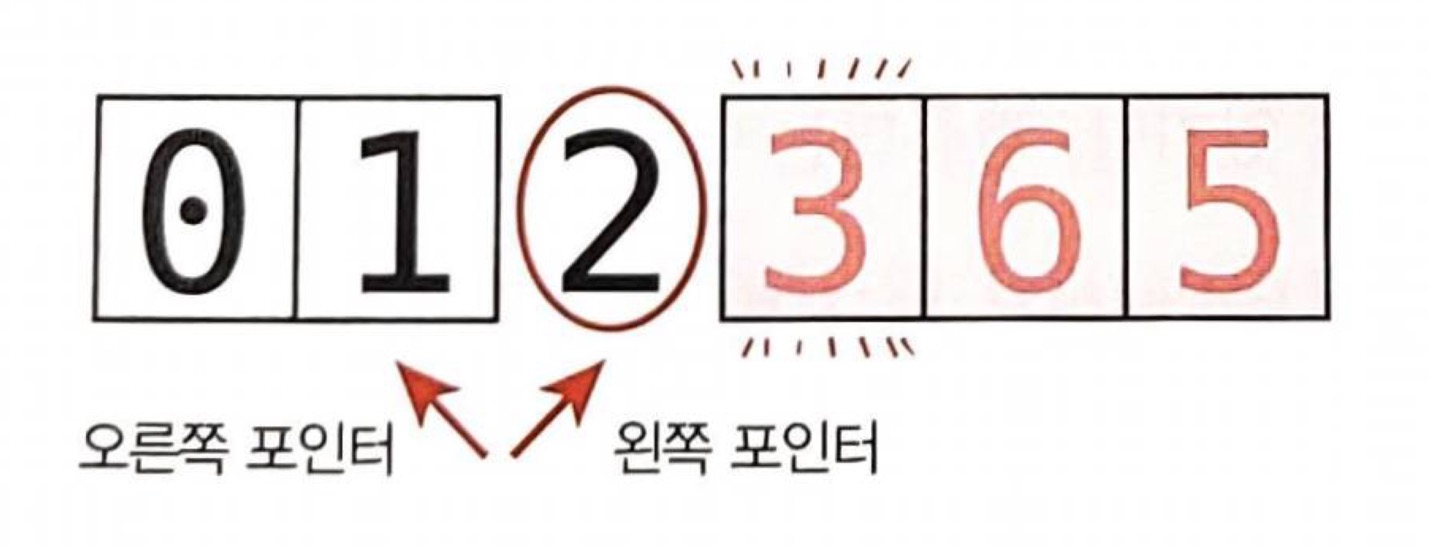 - 교환: 적절한 때에 왼쪽과 오른쪽 포인터가 가리키고 있는 값을 교환한다.