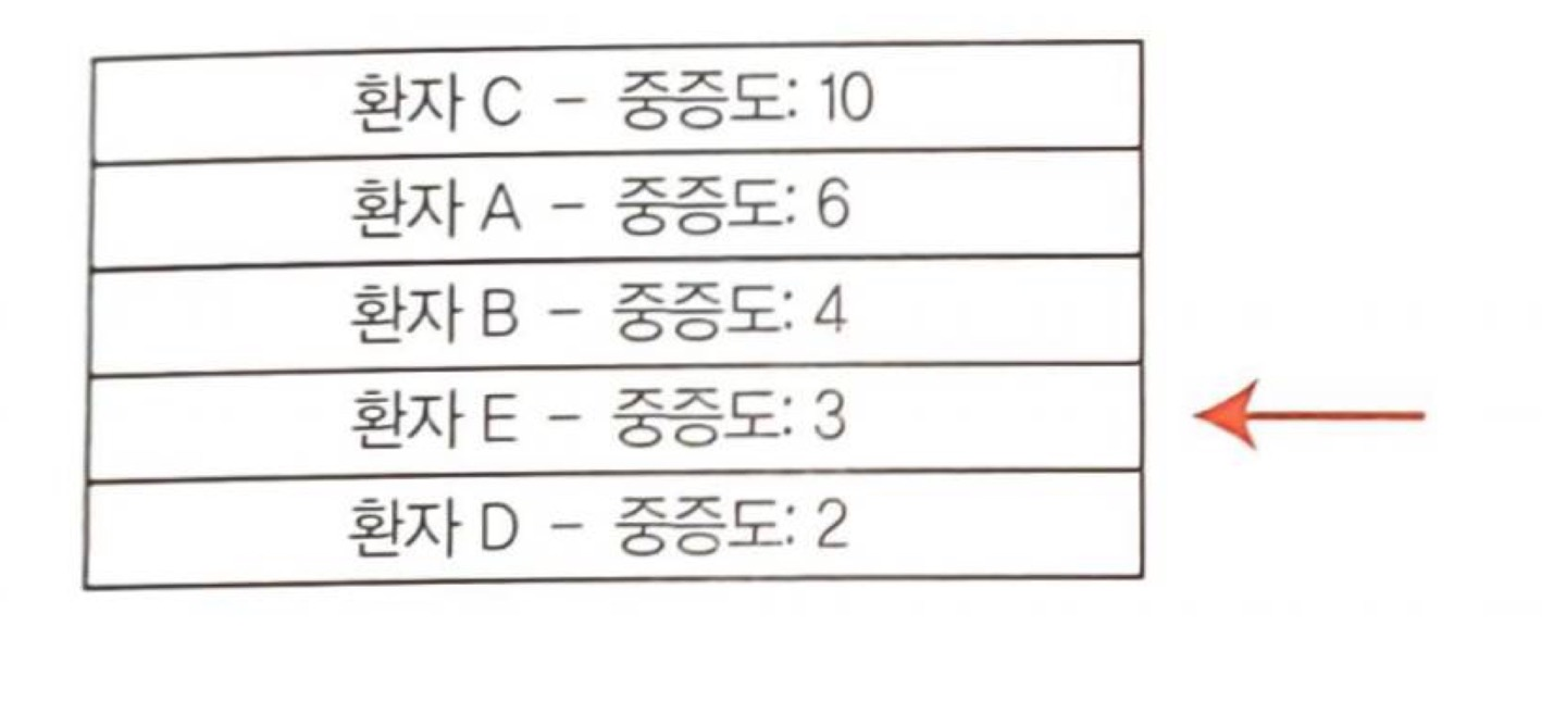 갑자기 중증도가 3인 다음 환자가 도착하면 "처음부터" 이 환자를 우선순위 큐 내 적절한 위치에 넣는다.