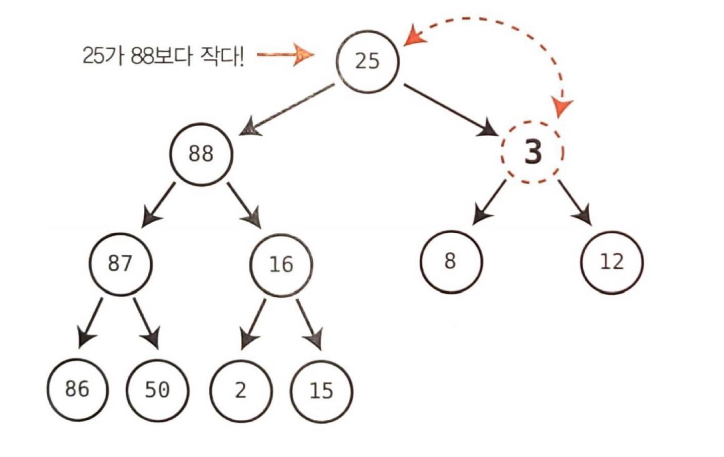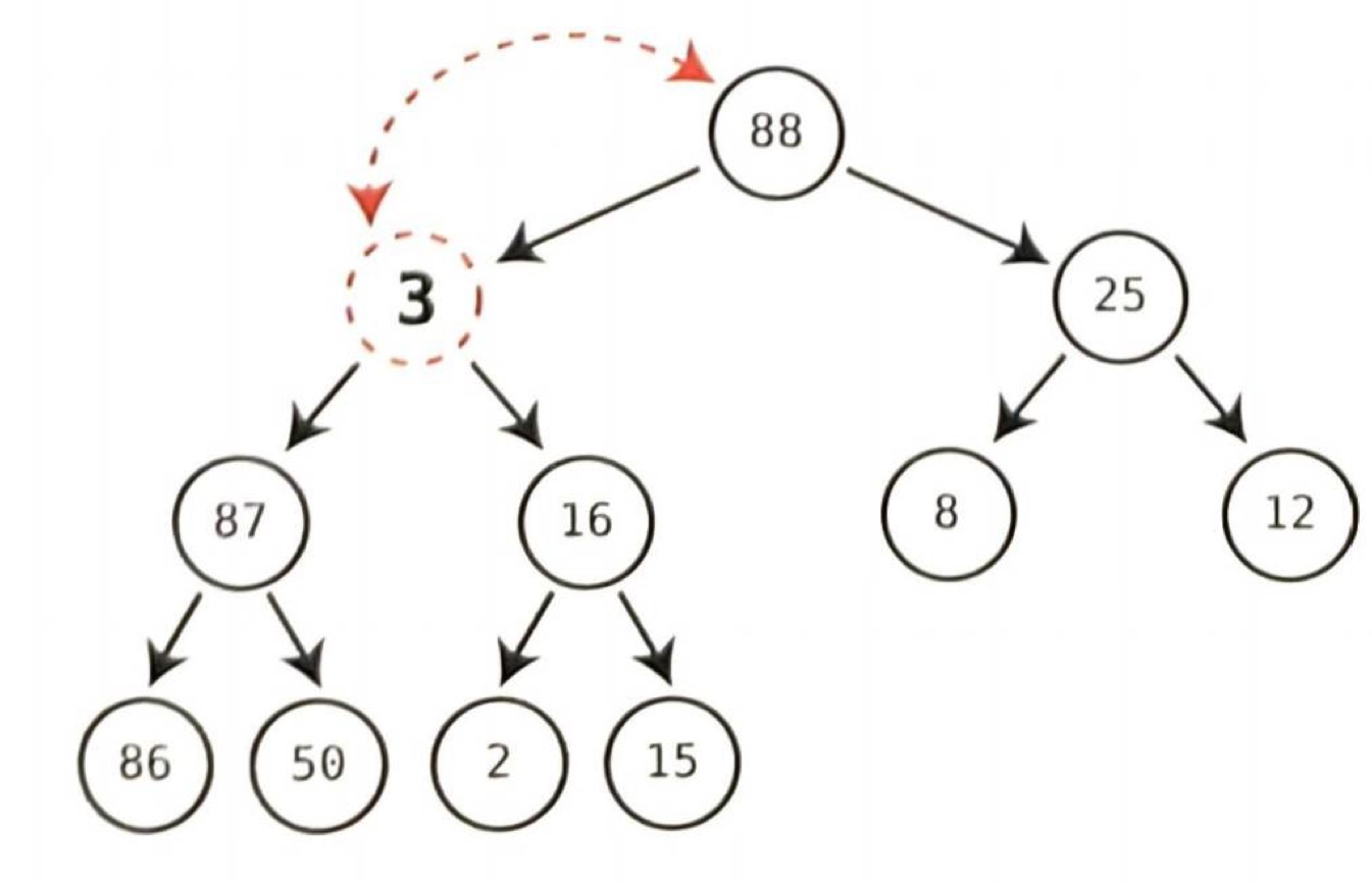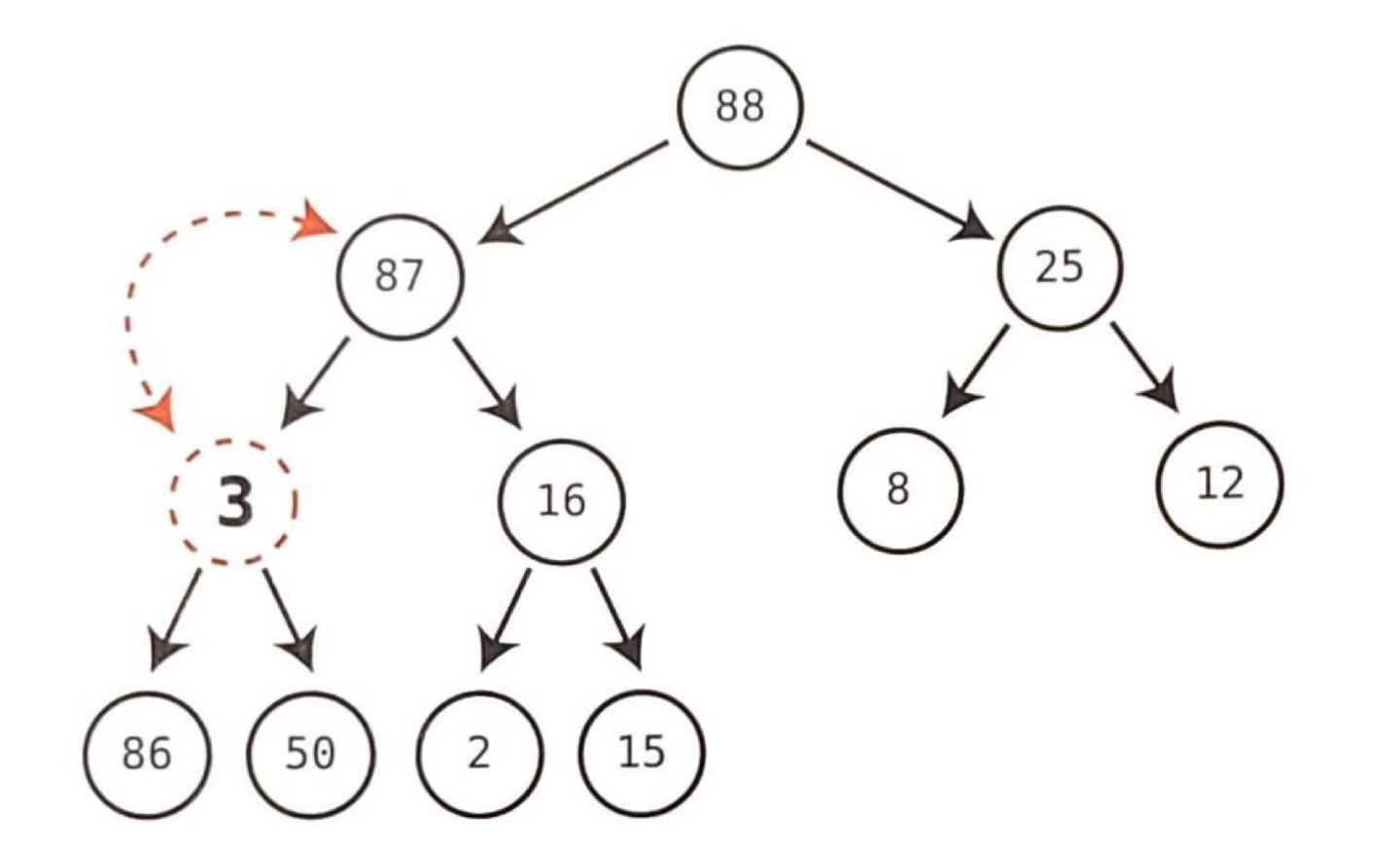 3의 자식 노드엔 88과 25, 두 자식이 있었다. 둘 중 88이 더 크고, 3보다 크니깐 88과 스왑한다.