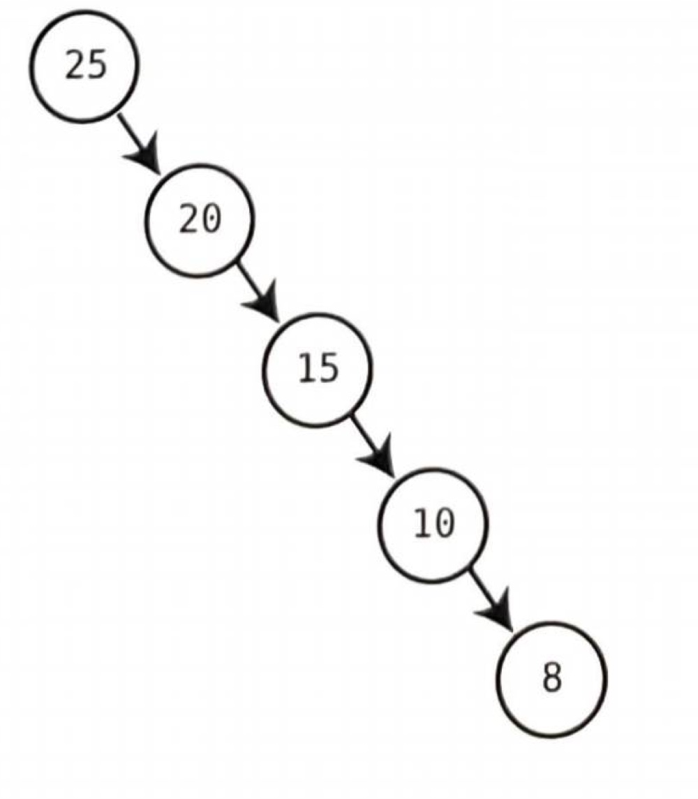 이러한 균형이 중요한 이유는 O(logN) 연산을 유지하기 위해서다. 다음과 같이 불균형이 심한 트리는 순회에 O(N) 단계가 걸린다.