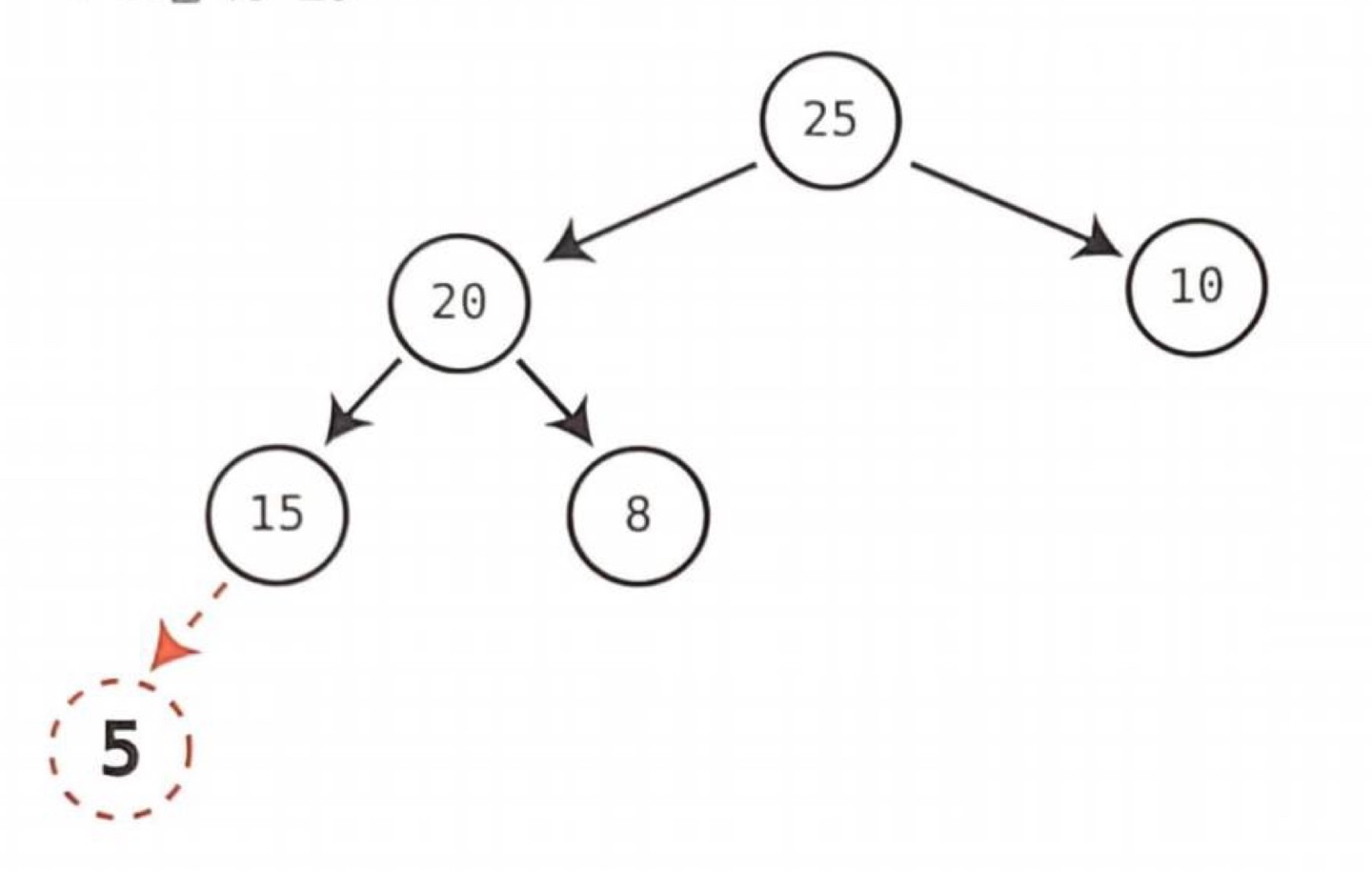 1) 새 값을 포함하는 노드를 생성하고, 바닥 레벨의 가장 오른쪽 노드 옆에 삽입한다. 이 값이 힙의 마지막 노드가 된다.