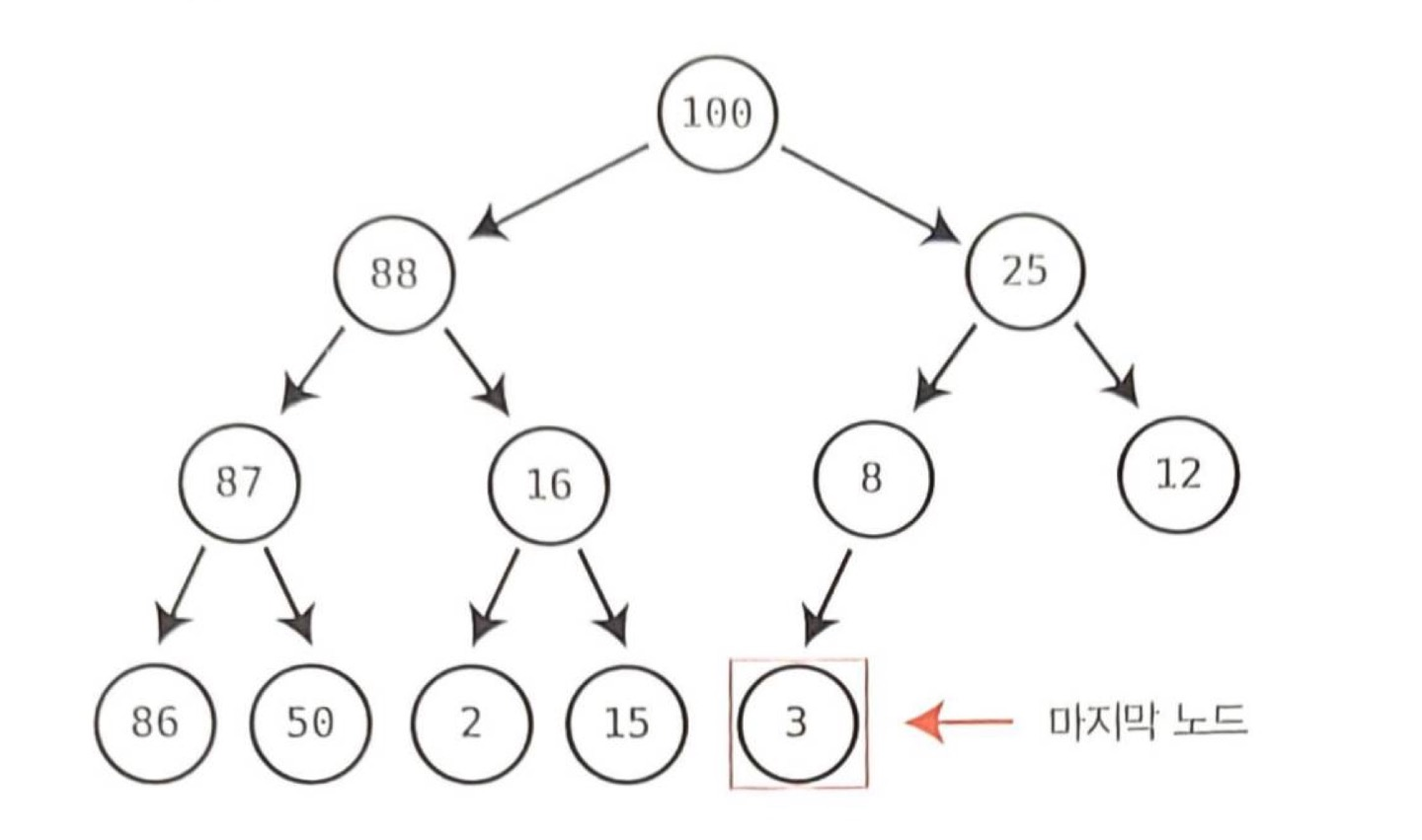힙에는 '마지막 노드(last node)'가 있다. 힙의 마지막 노드는 "바닥 레벨에서 가장 오른쪽에 있는 노드"다.