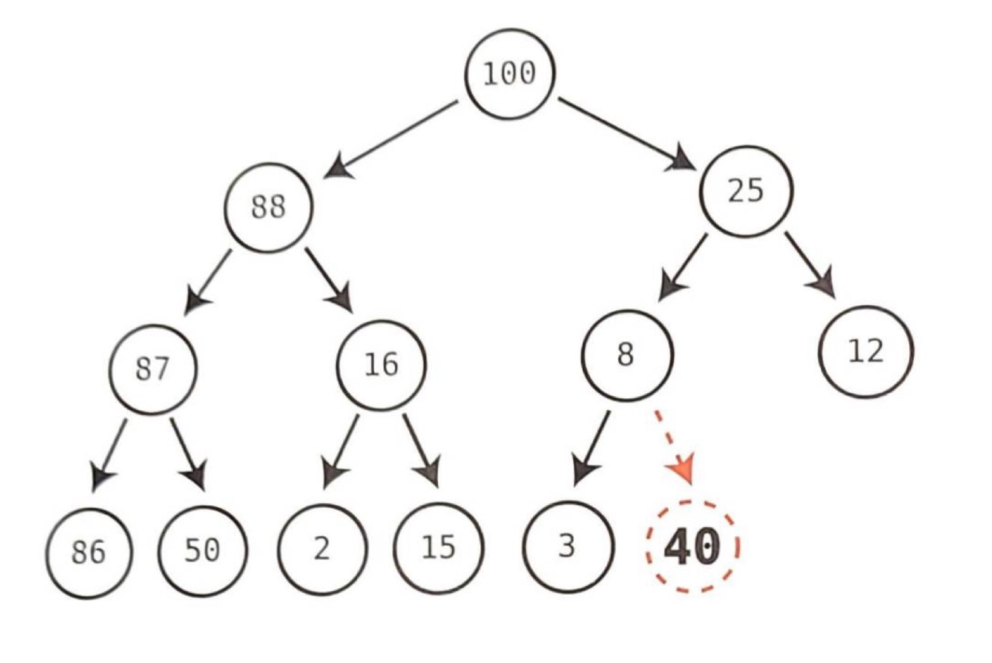 3) 새 노드보다 큰 부모 노드를 만날 때까지 2단계를 반복하며 새 노드를 힙 위로 올린다.