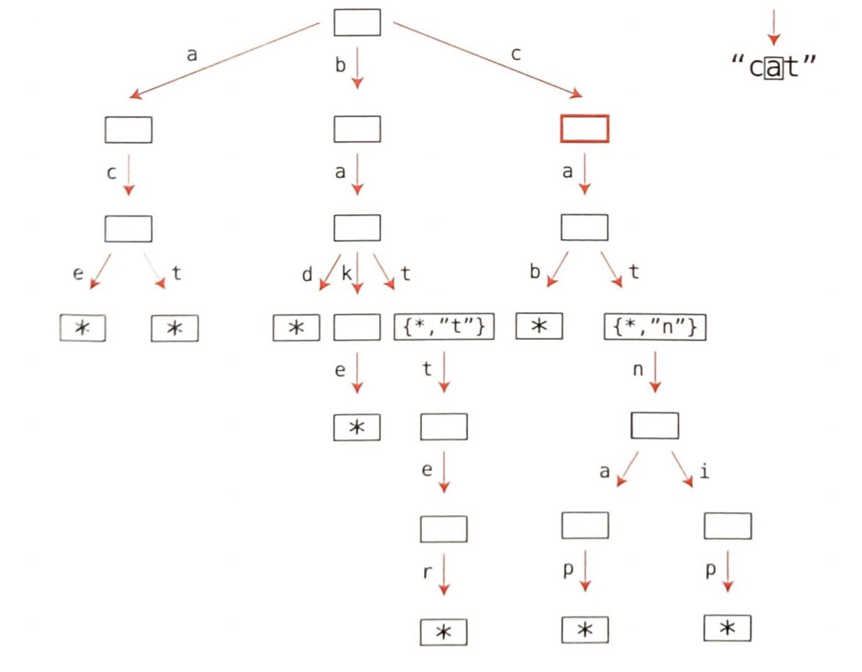 예를 들어 트라이에서 "cat"을 검색해보자.
