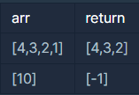 - 반환 타입이 int[] 이다. 따라서 배열의 길이가 1일 때 단순히 -1 을 반환하는 것이 안된다. 배열의 첫 번째 요소에 -1 을 대입시킨 후 해당 배열을 반환해야 한다. 꼼꼼히 보자.